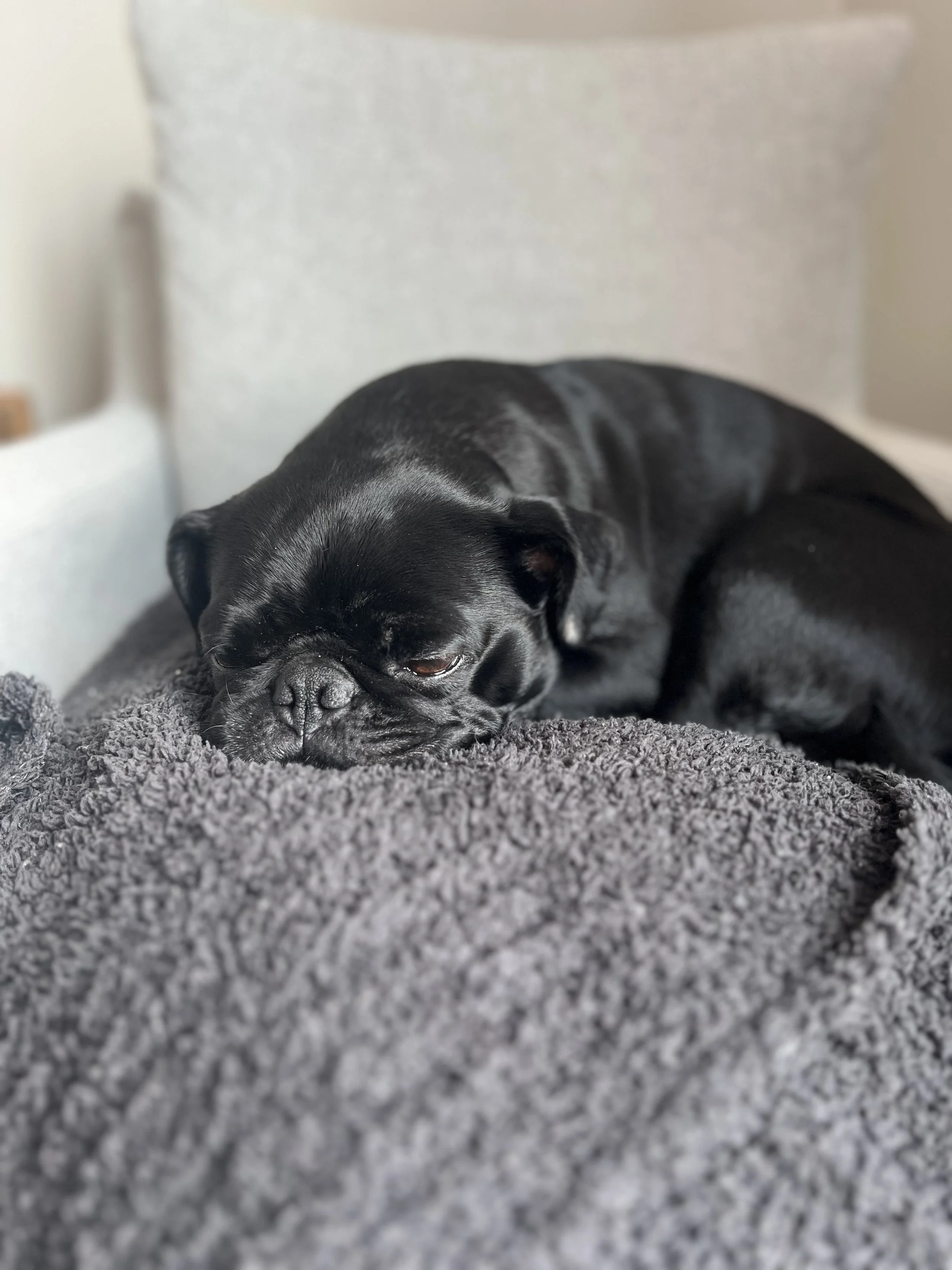 Meet Winston, Junior Copywriter. He’s a spunky, not-so-sleepy black pug who lives for snacks and park zoomies. During the work day you can find him faithfully sitting next to mom on his Barefoot Dreams blanket.